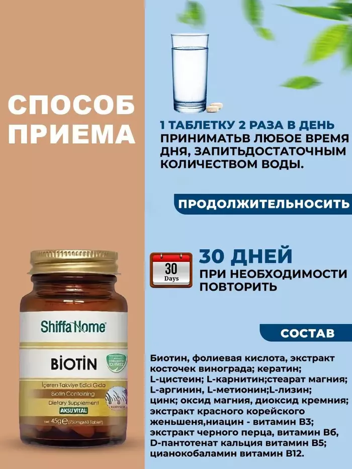SHIFA HOME | AKSU VITAL Биотин (5000 IU) рекомендуется принимать по одной таблетке в день во время еды. Продолжительность приема обычно составляет один месяц, при необходимости курс можно повторить. Перед началом приема рекомендуется проконсультироваться с врачом, особенно при наличии хронических заболеваний или индивидуальной непереносимости компонентов.