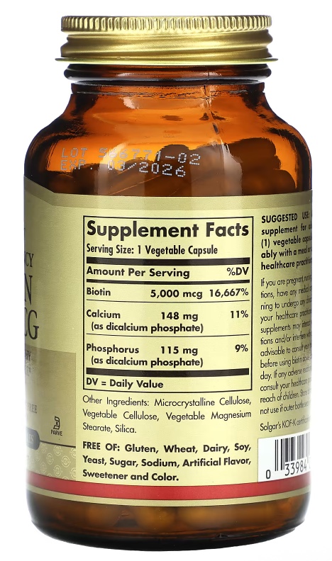 Биотин Solgar в растительных капсулах 5000мг — это высококачественная добавка, предназначенная для поддержания здоровья волос, кожи и ногтей. Каждая капсула содержит 5000 мкг биотина, что способствует улучшению общего состояния организма.