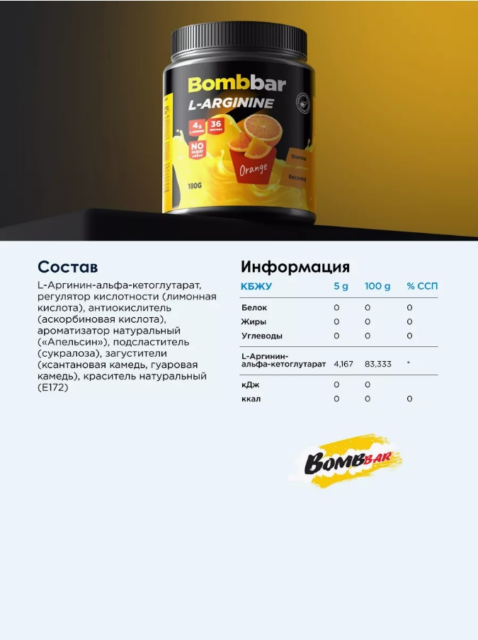 Продукт легко растворяется и быстро усваивается, что гарантирует его эффективность и доступность для организма. Упаковка объемом 180 г позволяет использовать добавку в течение длительного времени, обеспечивая нужную дозу L-аргинина на каждый день. Несмотря на наличие брака на товарной этикетке, качество продукта остается на высоком уровне. Bombbar Аргинин L-Arginin Апельсин – отличный выбор для людей, стремящихся повысить свою физическую форму и улучшить результаты тренировок.