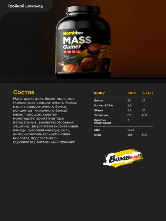 Bombbar Гейнер Mass Тройной шоколад, 2700 г