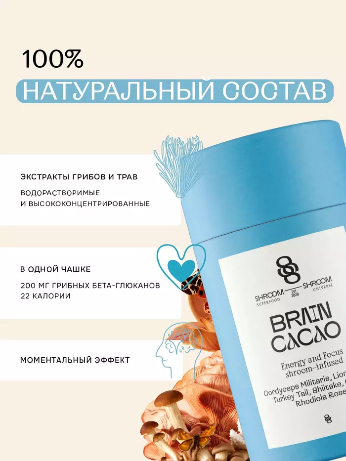 May the Force be with youЗ аряд бодрости по утрам. Усиливает концентрацию внимания и продуктивность, активирует память. Содержит природные ноотропы и адаптогены.Насыщенный аромат шоколада мгновенно пробудит и поможет настроиться на продуктивный день. Натуральным какао-бобам из Колумбии свойственна природная сладость, нотки ванили и карамели, а значит, пробуждение будет мягким. Густая шелковистая текстура позволит растянуть удовольствие от каждого глотка и ощутить все оттенки вкуса, и нотки орехов, и лёгкую фруктовую кислинку.СУПЕРГЕРОИ:ЕЖОВИК помогает сконцентрироваться, усиливает внимание и активирует память. КОРДИЦЕПС дарит энергию и бодрость. РОДИОЛА розовая снимает усталость, улучшает когнитивные функции. ТРАМЕТЕС, ЧАГА и ШИИТАКЕ усиливают иммунитет и повышают сопротивляемость организма.