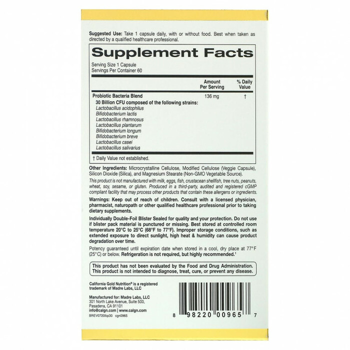 California Gold Nutrition Пробиотики Лактобиф (30 млрд КОЕ), 60 капсул