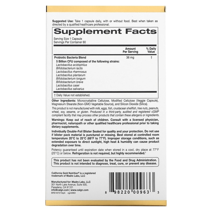 California Gold Nutrition Пробиотики Лактобиф (5 млрд КОЕ), 60 капсул