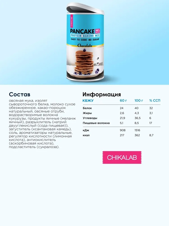 Смесь для выпечки Protein Pancake Baking Mix с шоколадом от бренда Chikalab — это отличный выбор для любителей вкусных и полезных завтраков. В каждой упаковке весом 480 г вы найдете идеальную основу для приготовления питательных панкейков с насыщенным шоколадным вкусом.