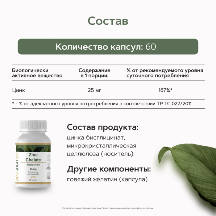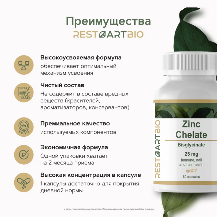 Цинк хелат бисглицинат (25 мг) от бренда RestartBio — это высококачественная добавка, которая обеспечивает организм необходимым количеством цинка в легко усваиваемой форме. В каждой упаковке содержится 60 капсул, что делает продукт удобным для ежедневного использования.