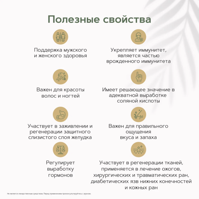 • Антиоксидантные свойства: Цинк помогает защищать клетки от окислительного стресса, поддерживая общее здоровье организма.