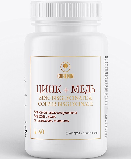 Цинк + Медь (500 мг) от бренда Corenin — это высококачественная добавка, которая поддерживает здоровье и нормальное функционирование организма. В каждой упаковке содержится 60 капсул, обеспечивающих оптимальное соотношение цинка и меди.