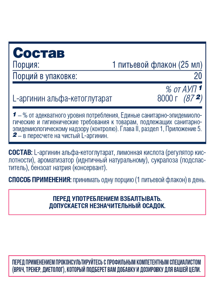 Рекомендации по применению: перед употреблением взболтать. Принимать по 1 порции (½ флакона) за 20-30 минут до тренировки. В дни усиленных занятий принимайте по одной целой питьевой ампуле перед тренировкой.