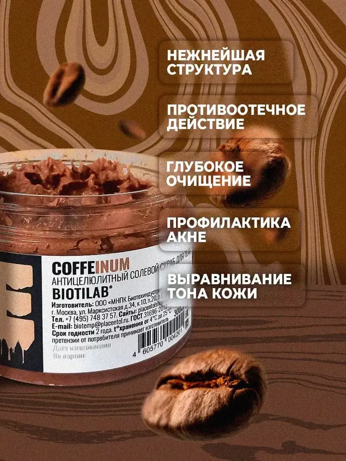 Coffeinum - Антицеллюлитный солевой скраб для тела — это эффективное средство для борьбы с целлюлитом и улучшения состояния кожи. Скраб содержит натуральные компоненты, которые способствуют улучшению микроциркуляции и выведению токсинов.