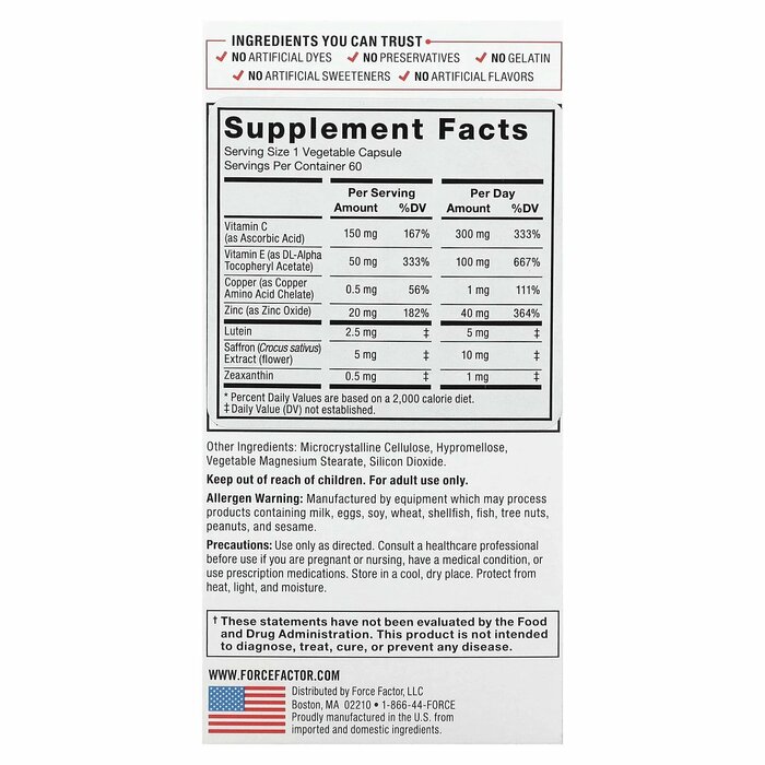 Force Factor® Complete Eye Health содержит научно проверенные ингредиенты, поддерживающие здоровье глаз и хорошее зрение: