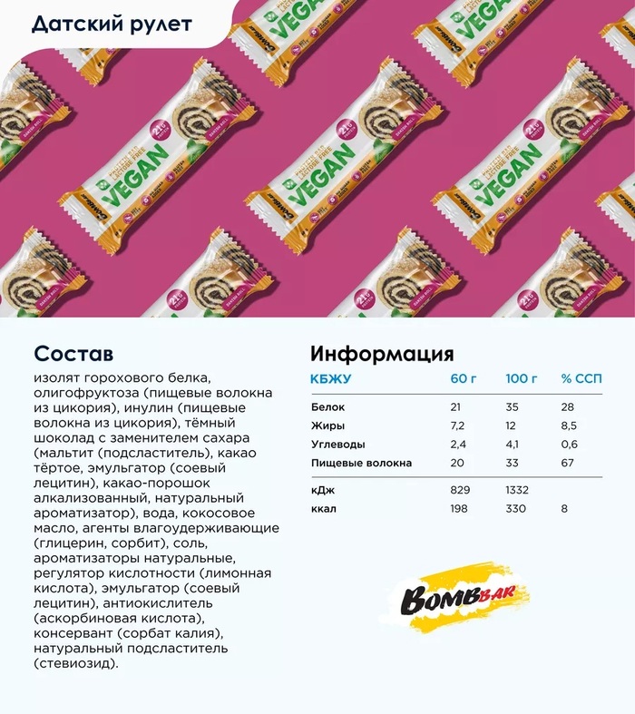Bombbar Протеиновый батончик неглазированный Датский рулет, 60 г