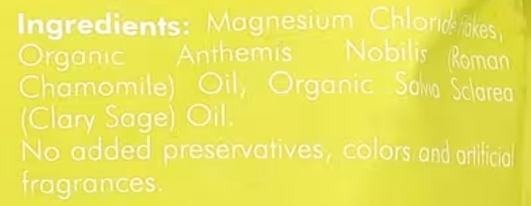Хлопья хлорида магния, масло органической ромашки (Anthemis nobilis), масло органического шалфея (Salvia sclarea).