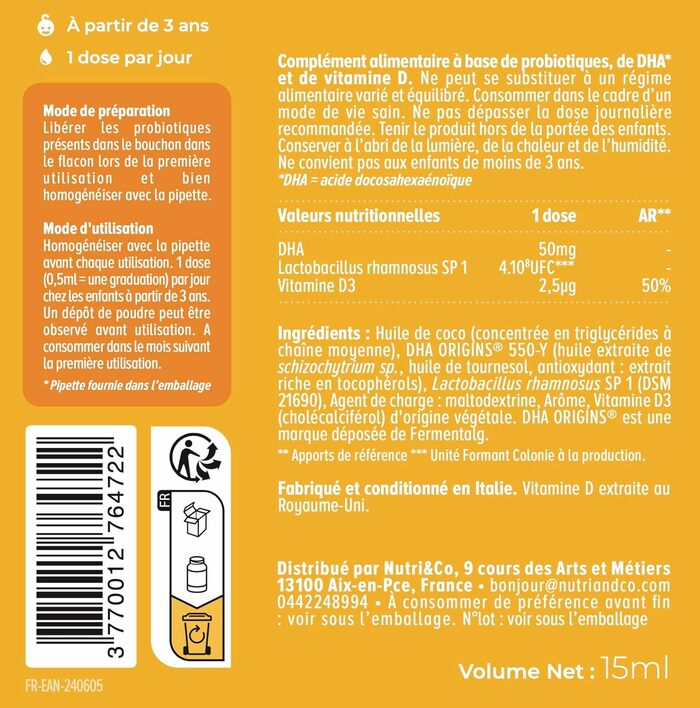 Детские пробиотики Nutri&Co с витамином D и Омега-3 — это отличный выбор для поддержания здоровья вашего ребенка. В каждой упаковке содержится 15 мл пробиотиков, которые помогут укрепить иммунитет и поддержать нормальное функционирование кишечника.
