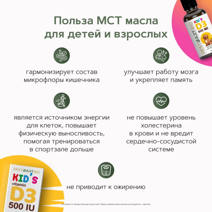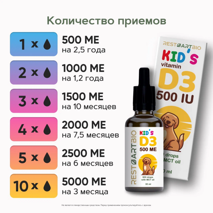 Детский D3 (500 МЕ), 30 мл от бренда RestartBio — это идеальное решение для поддержания здоровья детей. В каждой упаковке содержится высококачественный витамин D3, который необходим для нормального роста и развития.
