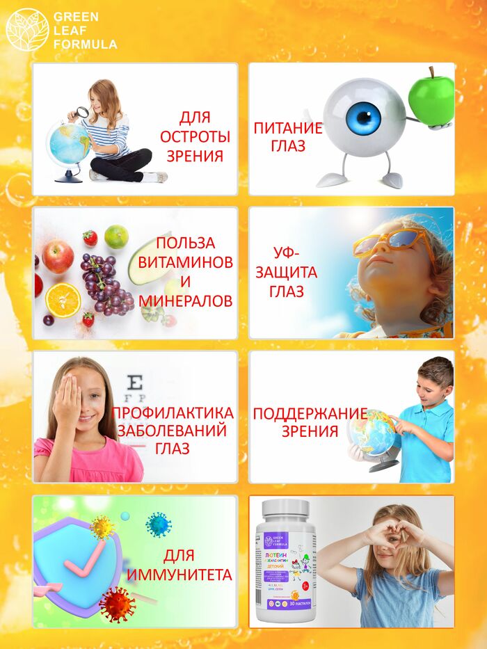 Детский Лютеин и Зеаксантин от бренда GREEN LEAF FORMULA — это идеальное решение для поддержания здоровья глаз ваших детей. В каждой упаковке содержится 30 жевательных пастилок с приятным апельсиновым вкусом, которые обеспечат защиту и поддержку зрения.