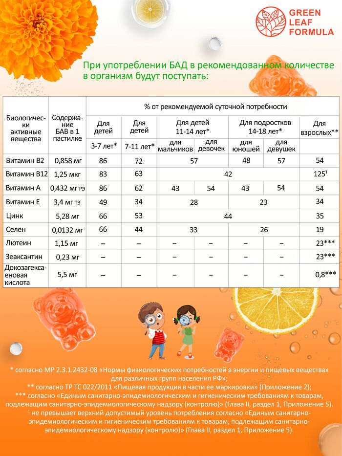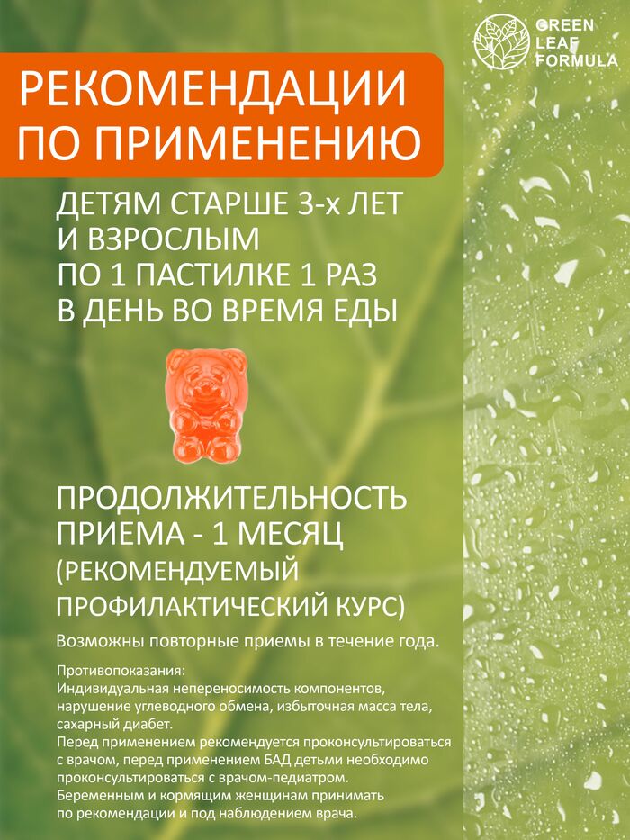 Жевательные пастилки имеют яркий апельсиновый вкус и привлекательную форму, что делает их особенно желанными для детей. Комплекс подходит для ежедневного использования, особенно в условиях повышенной нагрузки на зрение, например, при длительном использовании гаджетов.
