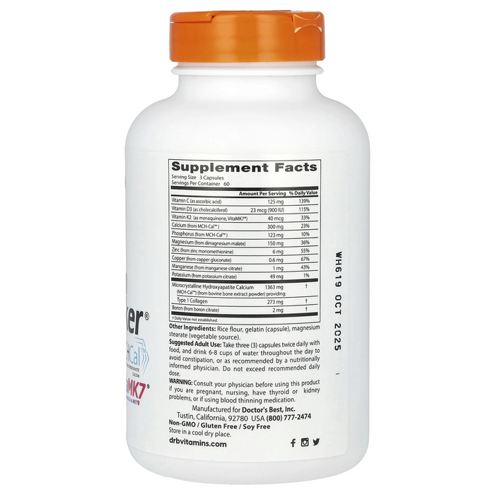 Комплекс Doctor's Best Calcium Bone Maker® с MCH-Cal ™ и VitaMK7® обеспечивает основные питательные вещества для костей в их наиболее биоактивных формах. Витамин С способствует формированию костного матрикса. Витамин D3 помогает поддерживать усвоение кальция в костях, а витамин K2 помогает направлять кальций в кости. MCH-Cal ™ содержит натуральные элементы, присутствующие в здоровых костях, включая кальций, фосфор и коллаген 1 типа. Кальций помогает мышцам, нервам и кровеносным сосудам перемещать кровь по всему телу, что влияет почти на все функции человеческого организма. Коллаген помогает формировать и поддерживать костный матрикс и соединительную ткань. MCH-Cal ™ помогает поддерживать оптимальный минеральный состав костей и общее состояние костей.