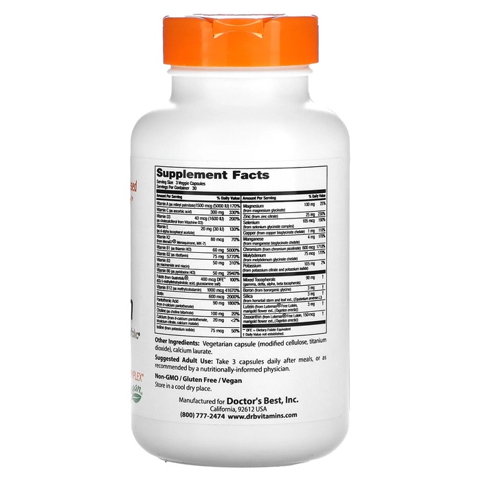 Мультивитаминный комплекс от Doctor's Best обеспечивает не содержащий железа полный спектр витаминов и микроэлементов, необходимых для здоровья человека. Национальное обследование здоровья и питания (NHANES, 1996–2016) показало, что почти у всех нас в рационе не хватает одного или нескольких из этих питательных веществ. Мультивитаминный комплекс Doctor's Best создан для обеспечения оптимальной питательной ценности.