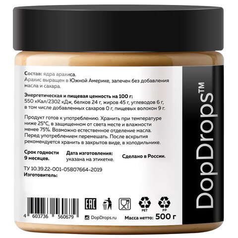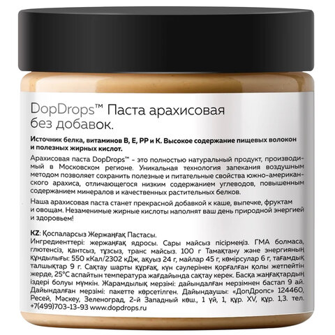 Арахисовая паста DopDrops производится в Московской области с использованием уникальной технологии запекания воздушным методом. Это позволяет сохранить все полезные свойства южно-американского арахиса, который отличается низким содержанием углеводов и высоким содержанием питательных веществ.