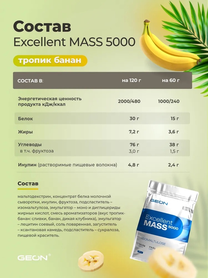 GEON Гейнер Экселлент Масс 5000 Тропик-банан — это высококалорийный гейнер, который разработан для быстрого набора мышечной массы и восстановления после интенсивных тренировок. В составе продукта сочетаются легкоусвояемые углеводы и высококачественные белки, что позволяет эффективно восполнять энергетические запасы и поддерживать оптимальное состояние организма. Благодаря этой комбинации, GEON Экселлент Масс помогает ускорить процессы роста мышц и повысить физическую выносливость.
