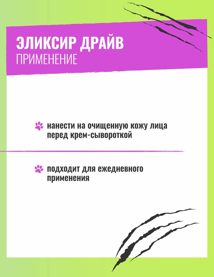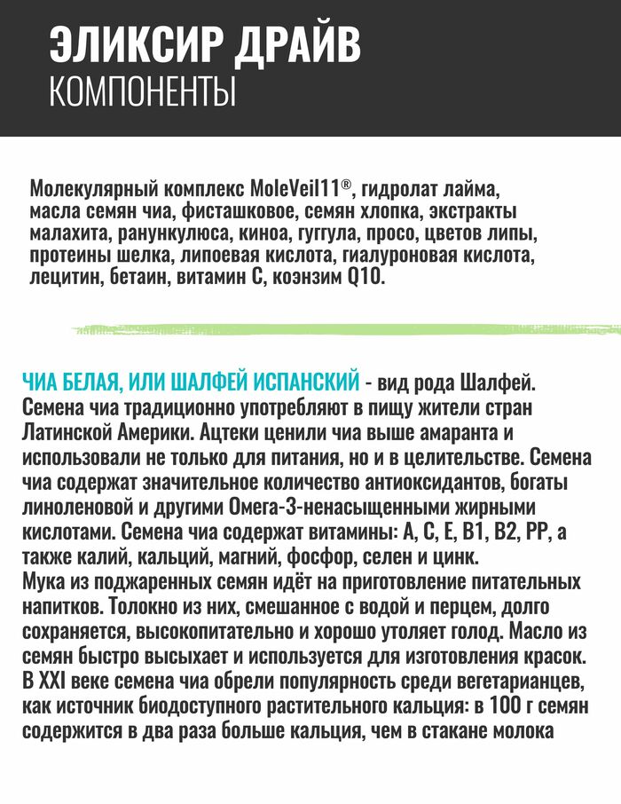 Перемен требуют не только сердца! Кожа также заслуживает Драйва и именно такого, с большой буквы – всего пара капель эликсира-энерготоника Drive и ей обеспечен заряд бодрости в виде мгновенного лифтинга, здорового цвета лица и интенсивного увлажнения.Средство предназначено для ухода за кожей комбинированного типа, уставшей, возрастной, чья хозяйка уверенно шагает по жизни и постоянно что-то преодолевает, и не всегда это что-то легко дается. Стрессы и годы безостановочно рисуют на лице свои узоры, и замедлить их творчество, а также быстро стереть мелкие штрихи под силу именно эликсиру Драйв.Его действие обусловлено мощным составом – бодрящим энерго-коктейлем, содержащим все необходимые ингредиенты для сбалансированного ухода за кожей смешанного типа, включая область вокруг глаз, и прицельной борьбы с проблемами, присущими ей.Масла фисташки и семян чиа обладают чудесным свойством интенсивно омолаживать кожу. Сей дуэт природных антиоксидантов активно борется с такими признаками старения, как морщины, способствуя разглаживанию имеющихся и профилактике появления новых. Масла повышают эластичность кожи, делают ее гладкой и упругой, а также помогают бороться с воспалениями и успокаивают даже самую чувствительную кожу.Гидролат лайма наполняет уставшую кожу энергией и повышает тонус. Ценным свойством лайма является способность очищать кожу и регулировать выделение кожного жира. В связи с этим экзотический цитрус активно помогает бороться с расширенными порами, комедонами и воспалениями, а также избавляет кожу от постакне.Протеины шелка – настоящее блаженство для кожи! Драйв не только сносит следы усталости своей взрывной волной, но и способен на нежнейший деликатный уход, благодаря протеинам и маслу семян хлопка. Эти компоненты проникают в глубокие слои кожи, насыщая ее аминокислотами, и образуют на поверхности защитную мембрану, уберегающую кожу от негативного воздействия внешней среды, а также препятствуют потере живительной влаги. Как результат – шелковая гладкость, защита от УФ-лучей и нормализация водно-липидного баланса.Комплекс экстрактов малахита, гиалуроновой кислоты, бетаина, ранункулюса и гуггула интенсивно тонизирует, увлажняет и восстанавливает водный баланс и цвет лица. В наше время очень актуальна такая особенность малахита, как способность защищать кожу от излучения экранов мониторов, смартфонов и иных приборов.Молекулярная вуаль также активно защищает кожу от внешних воздействий.Энерготоник бодрит не только кожу! Свежий аромат с лаймовой кислинкой помогает очистить мысли, встряхнуться ото сна и пробудить внутренние резервы для позитивного и эффективного проведения дня. Вечером же цитрусовый Драйв поспособствует расслаблению, снимет усталость и стресс.Стеклянный флакончик малахитового цвета надежно сохранит средство, а удобная пипетка обеспечит гигиеничное использование и капельное дозирование продукта.