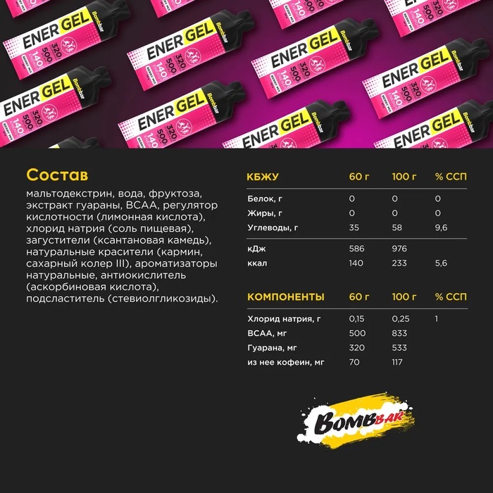 Вкус ягодного микса сочетает в себе насыщенные и освежающие нотки различных ягод, что делает его приятным на вкус и идеально подходящим для активных людей. Удобная упаковка по 60 г позволяет легко носить гель с собой и принимать его в любое время, будь то перед тренировкой или в её процессе. Bombbar ENERGEL — отличное решение для спортсменов, которые ищут быстрый способ поддержания энергии во время активности.