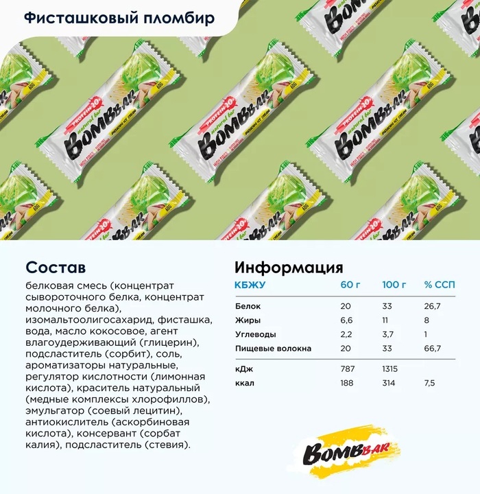 Bombbar Протеиновый батончик Фисташковый пломбир, 60 г