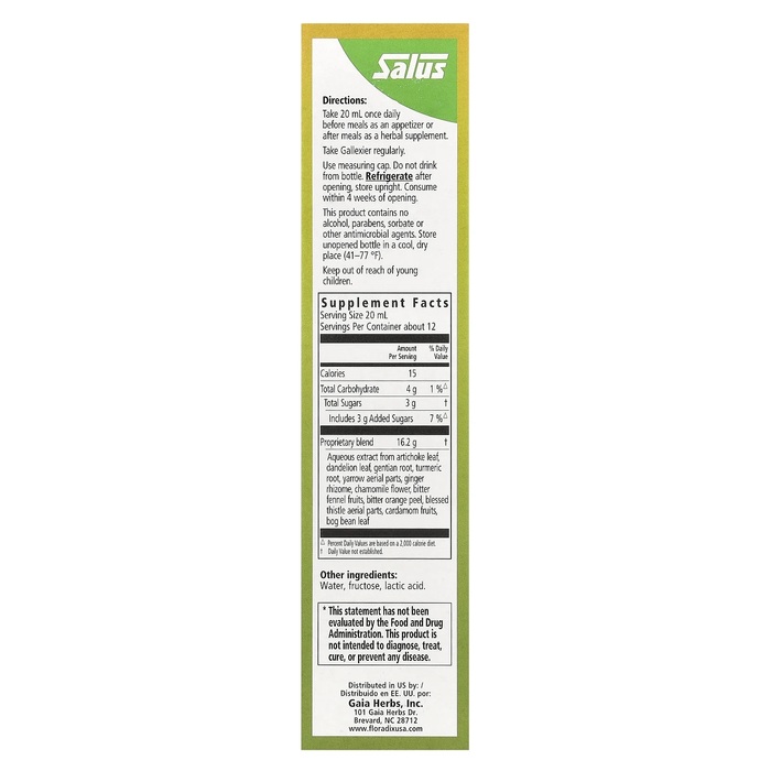 Принимать по 20 мл (отметка на крышке) в день перед едой для повышения аппетита или после еды в качестве травяной добавки. Принимайте Gallexier регулярно. Чтобы сохранить продукт и предотвратить его брожение, после вскрытия всегда храните его в холодильнике. Рекомендуется употребить в течение 4 недель.