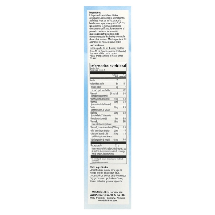 Дети от 4 лет и взрослые: Принимать по 10 мл (отметка на крышке) два раза в день во время еды. Хорошо встряхните флакон перед использованием. Чтобы сохранить продукт и предотвратить его брожение, после вскрытия всегда храните его в холодильнике. Рекомендуется употребить в течение 4 недель.
