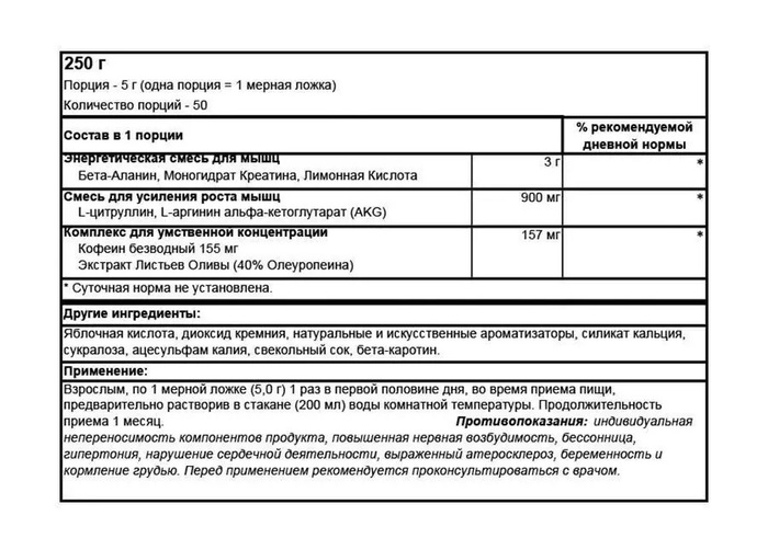 В зависимости от интенсивности предстоящей тренировки, а также индивидуальных физических показателей, размер порции может варьироваться от 1 до 3 мерных ложек порошка. Перед каждым приготовлением предтренировочного напитка рекомендуется встряхнуть содержимое банки. Смешать порцию с 150-250 мл воды. Готовый напиток выпить за 30-45 минут до тренировки. Не пейте более трех мерных ложек в течение 24 часов.