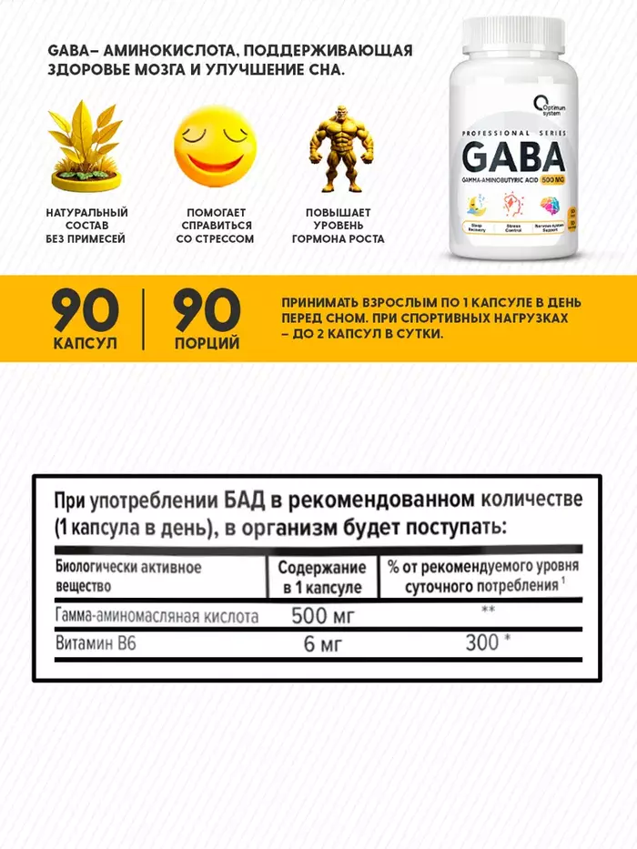 Гамма-аминомасляная кислота (GABA) от Optimum System — это важнейшая добавка для усиления восстановительных способностей организма, улучшения когнитивных функций и защиты мозга от воздействия стресса. ГАМК ускоряет прогрессирование в любых видах спорта за счет более качественного восстановления, даже при регулярных тяжелых тренировках. Также ГАМК Optimum System может применяться для улучшения качества сна, повышения настроения, защиты от стресса у людей, которые не занимаются спортом.