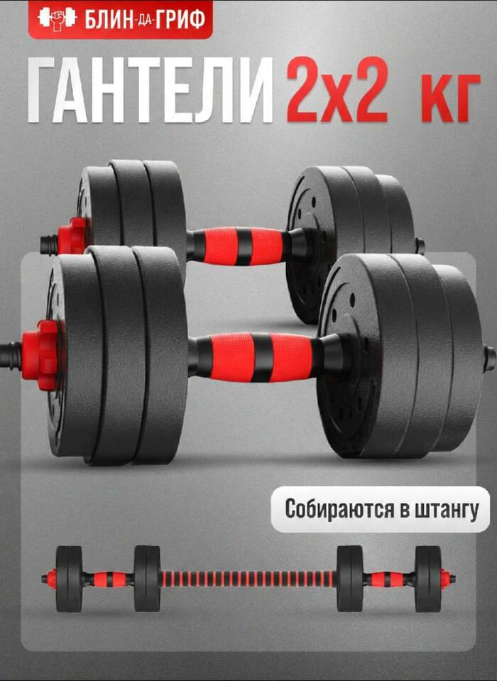 БлинДаГриф Гантели неопреновые 2 кг 2 шт, с переходником для штанги, общий вес 4 кг