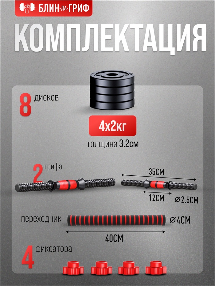 БлинДаГриф Гантели разборные 4 кг 2 шт, с грифом, регулируемые, общий вес 8 кг