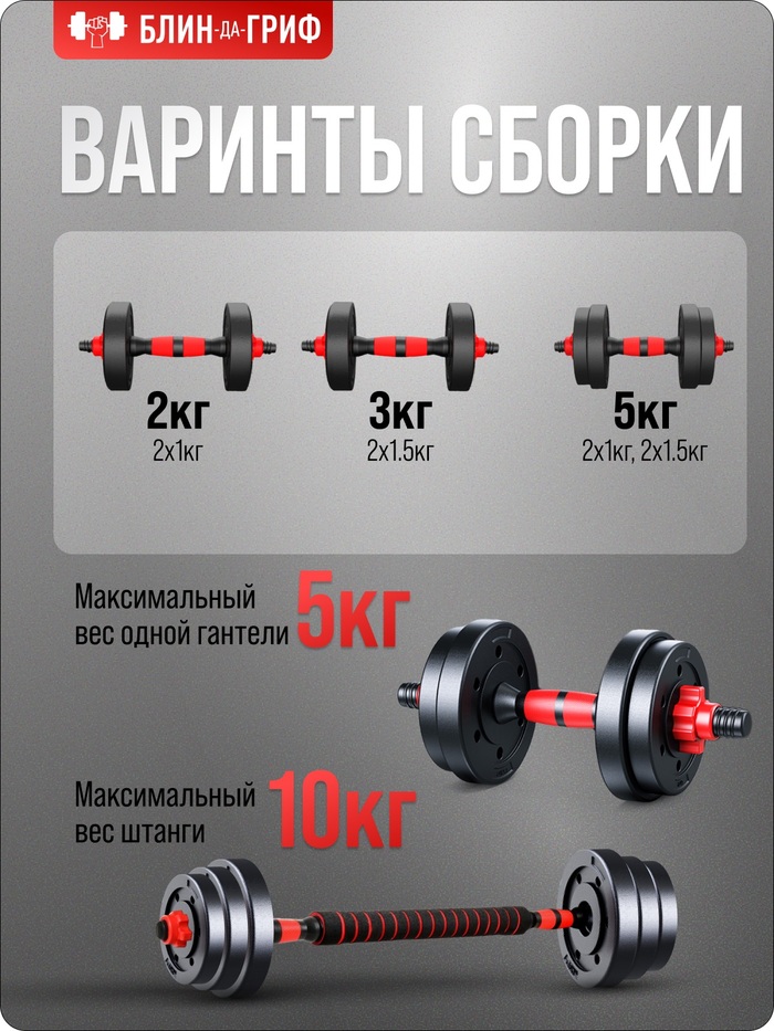 БлинДаГриф Гантели разборные 5 кг 2 шт, с грифом, регулируемые, общий вес 10 кг
