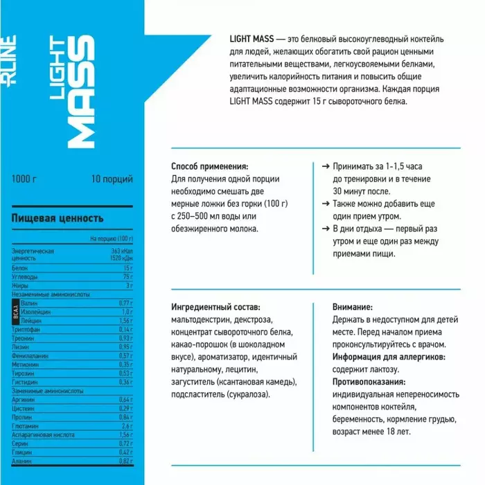 R-LINE Гейнер MASS Ваниль, 1000 г — это высококачественный продукт для набора массы, специально разработанный для спортсменов и активных людей, стремящихся увеличить мышечную массу и улучшить физическую форму. Этот гейнер сочетает в себе оптимальное соотношение белков и углеводов, обеспечивая организм необходимыми питательными веществами для эффективного восстановления и роста мышц.