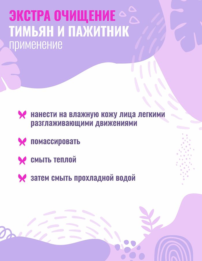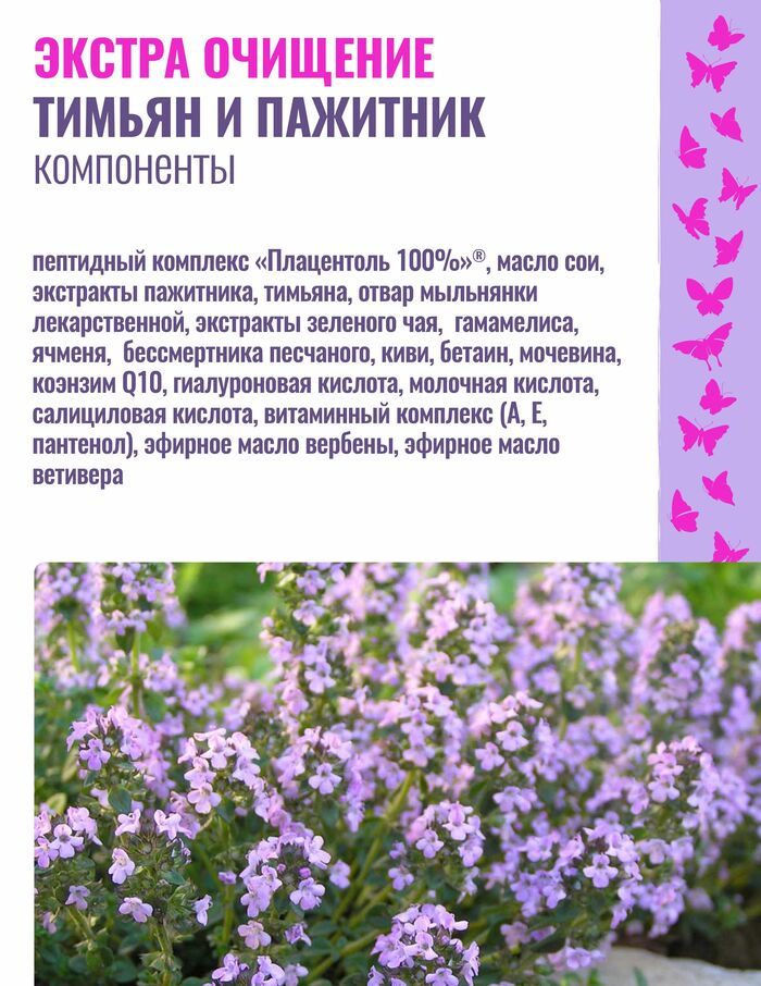 • Тимьян: помогает поддерживать ощущение свежести и чистоты, подходит для ежедневного применения.