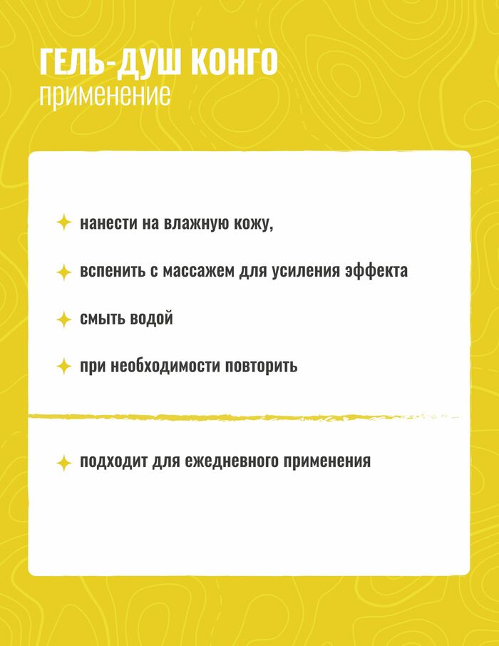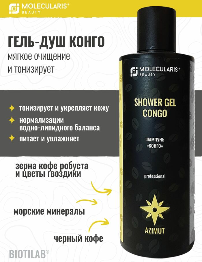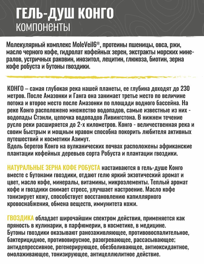 «Конго»- восстанавливающий молекулярный пептидный гель для глубокого очищения кожи.Эффективно очищает, тонизирует и укрепляет кожу, способствует нормализации водно-липидного баланса и восстановлению естественной защиты. Эксклюзивный комплекс натуральных активных компонентов насыщает кожу витаминами и минералами, питает и увлажняет, помогает справиться с усталостью, снимает мышечное напряжение. Приятный кофейный аромат заряжает энергией.Средство прошло клинические испытания.Если во время эксплуатации у Вас возникли вопросы,мы ответим на них. Гель-душ «Конго»-отличный выбор для Вашей кожи!