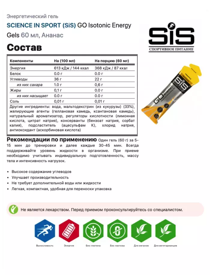 SiS Гель изотонический Russia GO Isotonic Energy Gels Ананас, 60 мл — это инновационный энергетический продукт, созданный для быстрого восполнения энергии и поддержания выносливости во время интенсивных тренировок и соревнований. Благодаря уникальной формуле, гель обеспечивает мгновенное поступление углеводов в организм, что способствует поддержанию высокого уровня энергии и улучшению спортивных результатов.