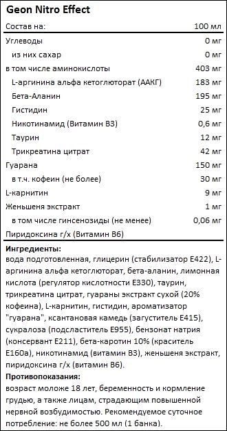 Кроме того, он содержит никотинамид (витамин B3) и таурин, способствующие повышению выносливости и улучшению концентрации внимания. Не упустите возможность купить GEON Nitro Effect в нашем интернет-магазине.