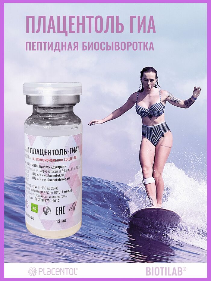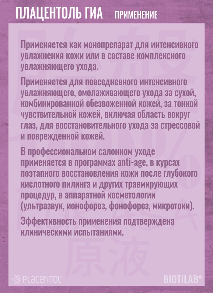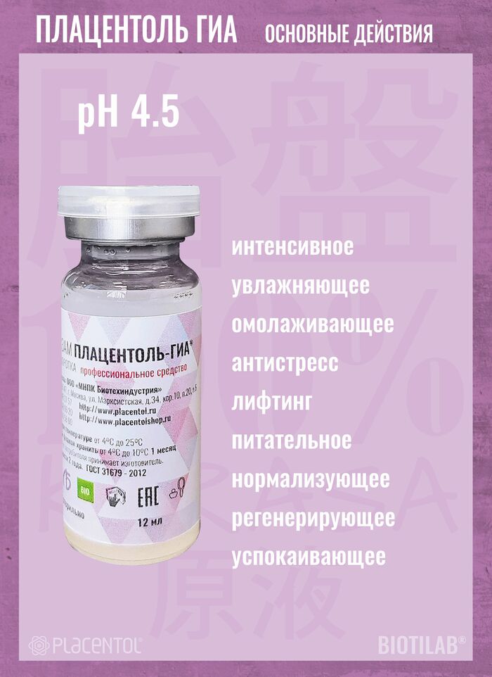 Содержание биологически активных веществ в «Плацентоль ГИА»: гиалуроновая кислота, хондроитин сульфат, аминокислоты, пептиды, глутатион, нуклеиновые кислоты, коэнзим Q10, ДМАЭ, ацетилхолин, цитокины, витамины, макро и микроэлементы.