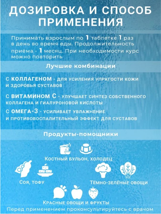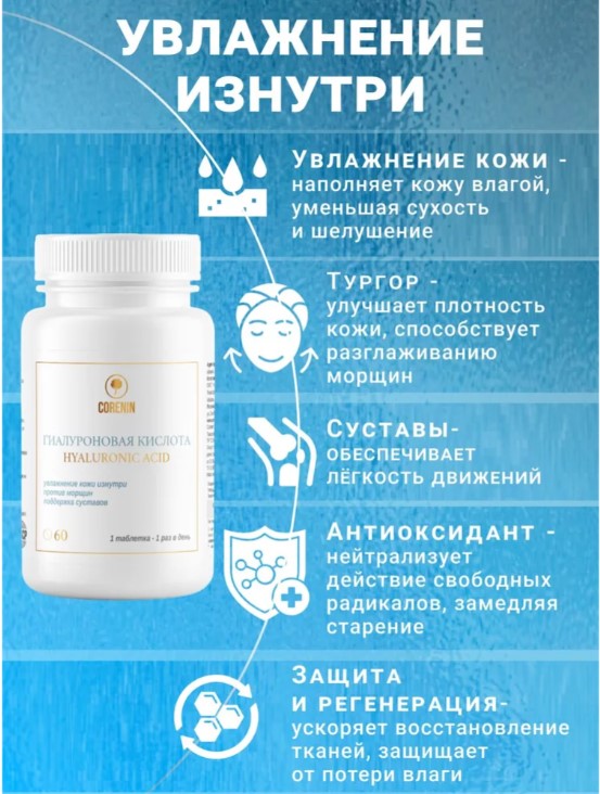 Таблетки Гиалуроновой кислоты от Corenin имеют оптимальную дозировку и подходят для людей всех возрастов. Рекомендуется использовать в качестве дополнения к сбалансированному питанию для достижения наилучших результатов.