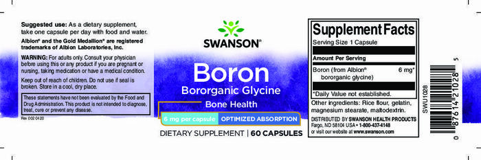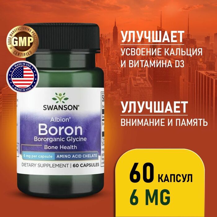 Для крепких и здоровых костей необходим бор, но этот минерал может плохо усваиваться организмом. Борорганический глицин Swanson® от Albion оптимизирует всасывание и биодоступность для обеспечения эффективного приема добавки. Albion - лидер в производстве минералов с высокой степенью усвояемости, а также в производстве уникальных минералов, которым можно доверять. Каждая капсула содержит 6 мг бора.