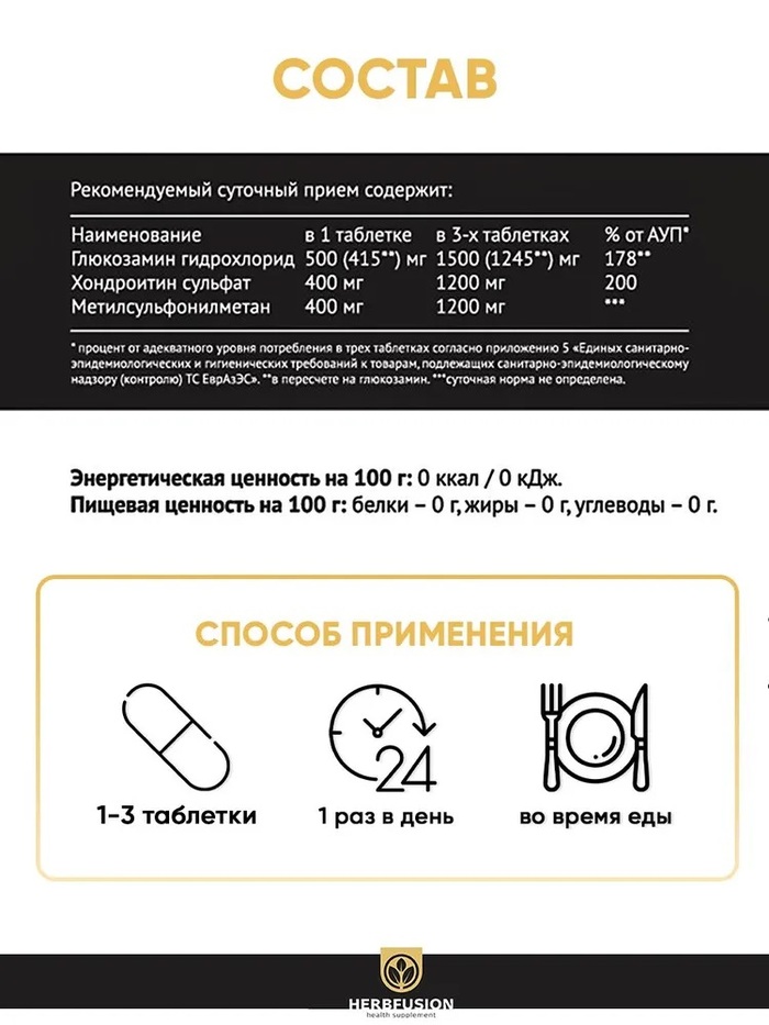 Глюкозамин Хондроитин, MSM от бренда HERBFUSION — это эффективная добавка для поддержания здоровья суставов и связок. В каждой упаковке содержится 90 таблеток, которые помогут вам заботиться о вашем опорно-двигательном аппарате.