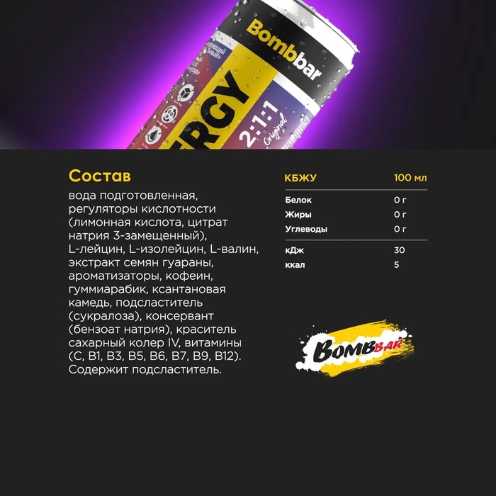 Готовые напитки Bombbar Energy BCAA 2:1:1 — это отличный выбор для активных людей, стремящихся поддерживать свою физическую форму. Каждый напиток объемом 330 мл содержит оптимальное соотношение аминокислот, что делает его идеальным для восстановления после тренировок.