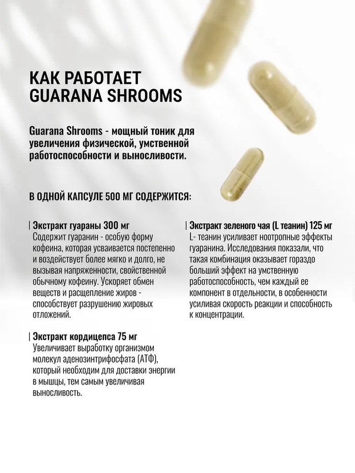 Guarana Shrooms энергия и выносливость. Мощный тоник, который повышает физическую и умственную активность. Снижает аппетит и способствует похудению, позволяя дольше обходиться без усталости. Кофеин, находящийся в гуаране, не обладает агрессивными свойствами.