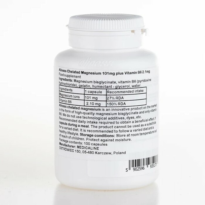 Хелатный магний + Витамин B6 Aliness — это высококачественная добавка, которая поддерживает нормальное функционирование организма. В каждой упаковке содержится 100 капсул, обеспечивающих оптимальное усвоение магния и витамина B6.