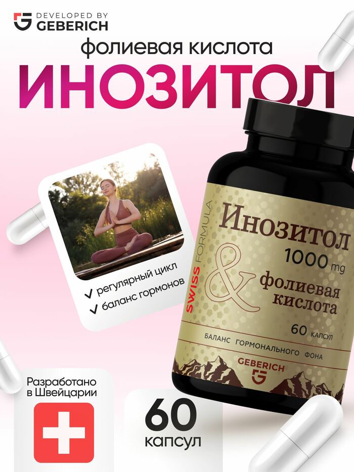 Geberich Инозитол 1000 мг с фолиевой кислотой Geberich для женщин и гормонального баланса, 60 капсул