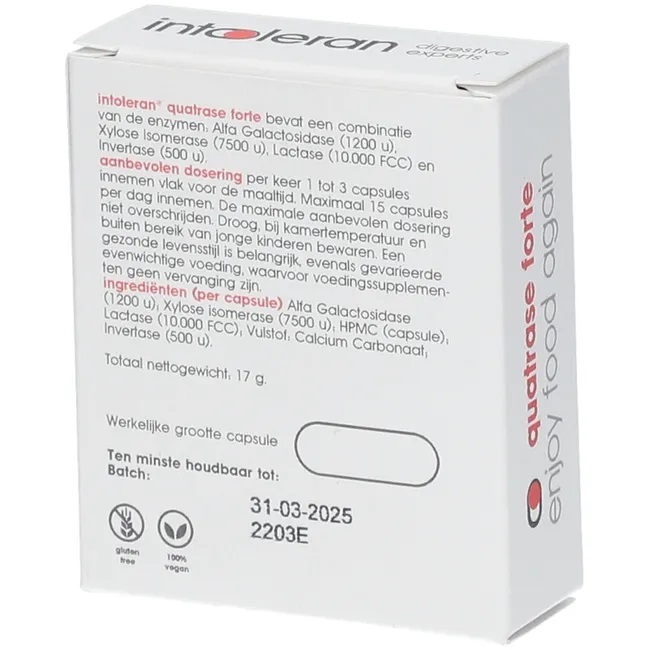 Капсулы Intoleran Quatrase Forte имеют специальную оболочку, которая защищает ферменты от разрушения в кислой среде желудка, обеспечивая их активность в кишечнике. Продукт подходит для людей с непереносимостью лактозы и глютена.