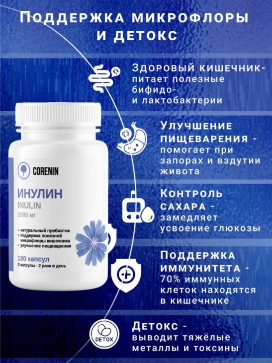 Инулин 470 мг — это высококачественная добавка от бренда Corenin, которая поддерживает здоровье пищеварительной системы. В каждой упаковке содержится 180 капсул, что обеспечивает длительный курс приема.