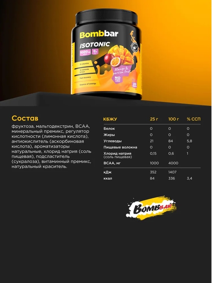 Bombbar Изотоник Манго-маракуйя отличается высоким качеством ингредиентов и тщательно сбалансированной формулой. Продукт идеально подходит для спортсменов, фитнес-энтузиастов и всех, кто стремится поддерживать активный образ жизни. Изотоник не содержит искусственных красителей и консервантов, что делает его безопасным для здоровья.